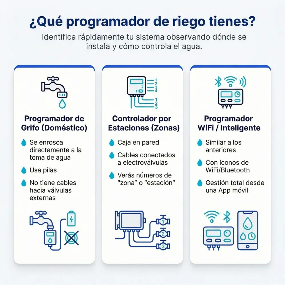 Si dudas, un truco rápido: si ves palabras como “estación”, “zona”, “válvula” o cables a varias salidas, es un controlador por estaciones. Si se enrosca al grifo, es un programador de grifo.